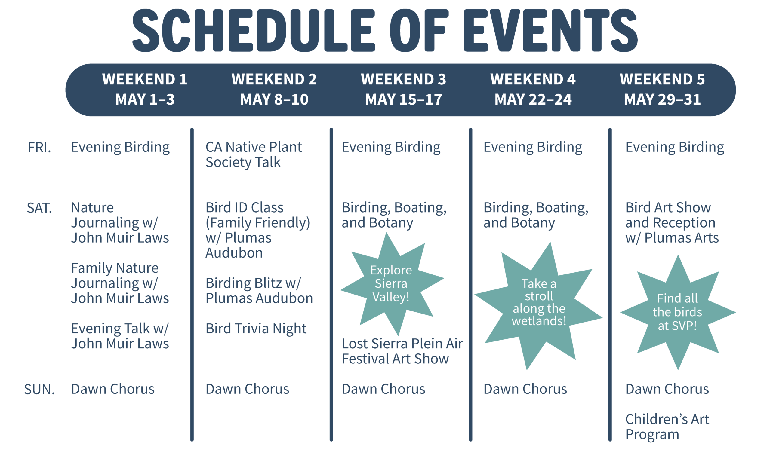 With 3+ events each weekend in May, there’s something for everyone! From nature journaling with artist John Muir Laws, to guided birding by kayak and by land, to kids’ activities, art, and a Bird Blitz to help count all the birds at Sierra Valley Preserve, we hope you’ll join us—for one event or several!